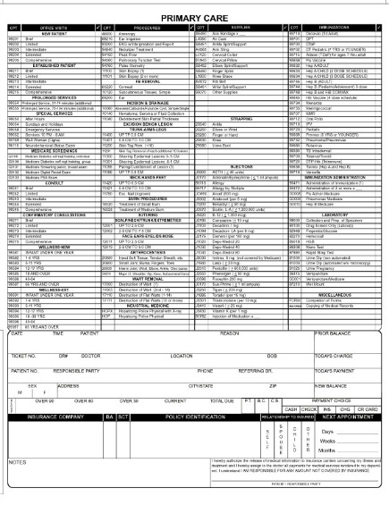 Below is a typical superbill you would likely see for a family practice with the most commonly used ICD-9 diagnosis and CPT codes listed. You’ve probably seen something similar for your own doctor visit.
